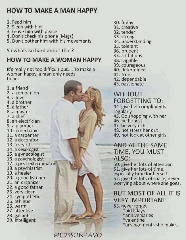 There is no one way to make a guy happy and vice versa. Everyone is different so instead of making a relationship out of what you see on social media, how about you take time to know your partner and make them happy because you actually know what makes them happy. Some of these things you see on social media are not entirely correct. So Live, Learn Your Person and Love Then!